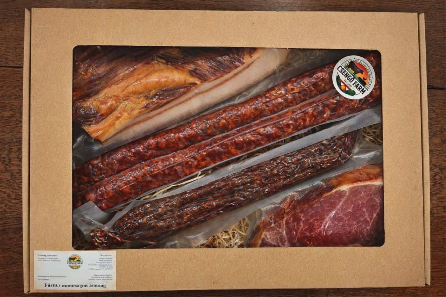 min. 1500 g Csomag tartalma: téliszalámi, füstölt kolbász, füstölt szalonna, füstölthús Hagyományos füstölés. Nitrites sót nem tartalmaz. Tárolás: száraz, hűvös helyen!