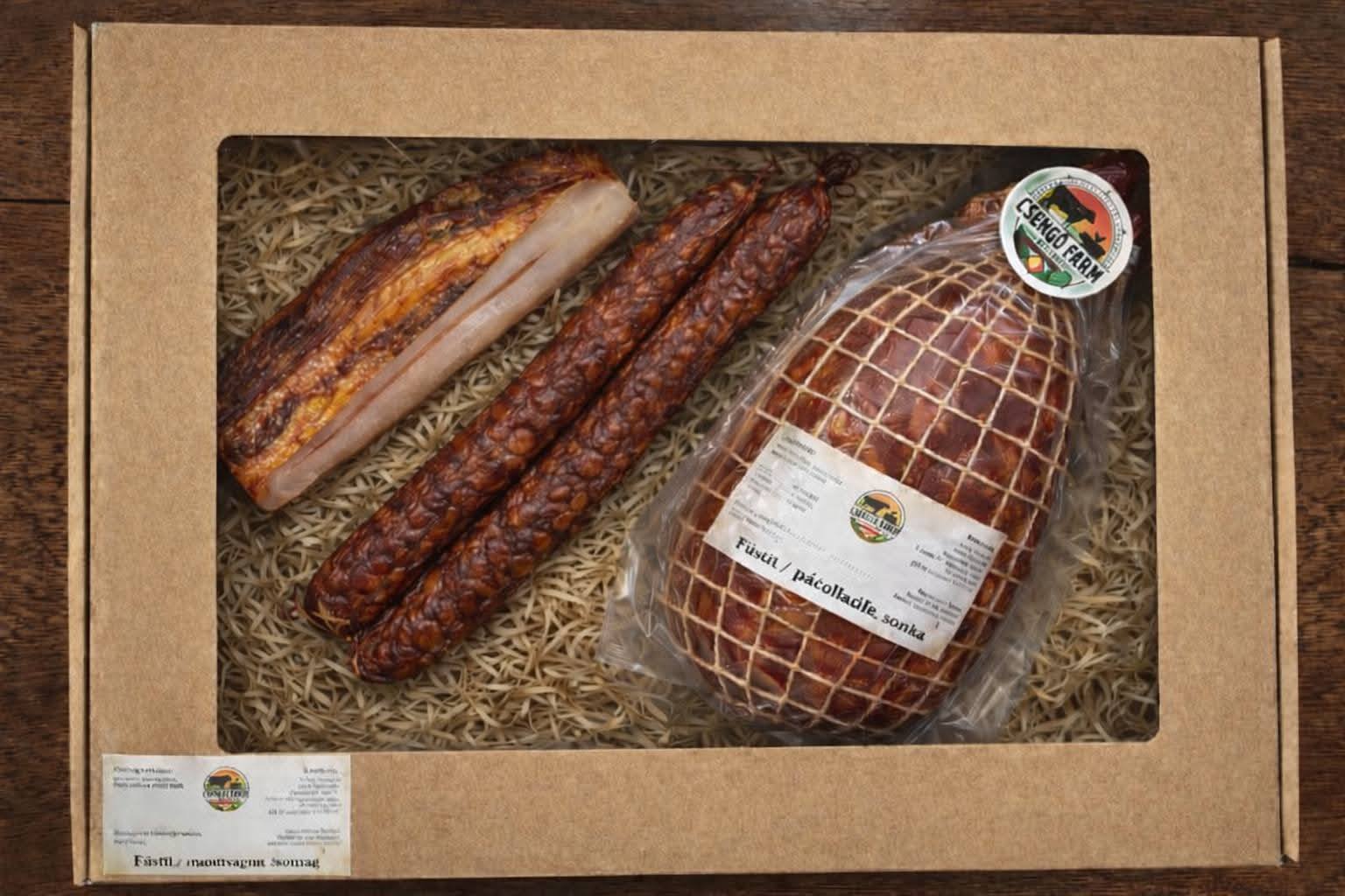 min. 1600 g Csomag tartalma: füstölt kolbász, füstölt szalonna, füstölt kötözött comb sonka Hagyományos füstölés. Nitrites sót nem tartalmaz. Tárolás: száraz, hűvös helyen!